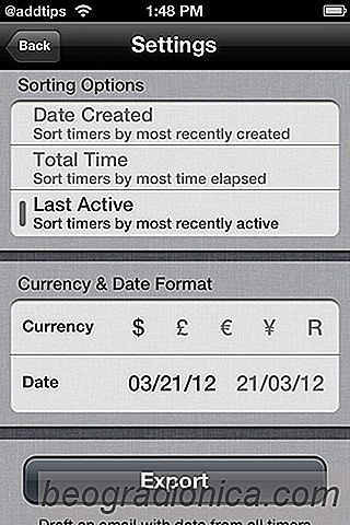 Hay un botón grande de reproducción / pausa junto al temporizador de cada proyecto en la página principal de Sesiones, que puede se utilizará para indicar el momento en que la aplicación comienza a registrar sesiones y su pago correspondiente. Para ver los detalles de un proyecto, toque el botón de flecha junto al temporizador y, a partir de ahÃ, es posible borrar los registros anteriores o eliminar el proyecto por completo. Estas secciones también enumeran la duración promedio de la sesión y las ganancias. La mejor caracterÃstica de Sessions es su capacidad de permitir a los usuarios exportar sus registros de proyectos por correo electrónico. Solo tiene que tocar el botón Exportar y los datos aparecen en un borrador de correo electrónico. Desde el menú de configuración de la aplicación, es posible elegir un criterio de clasificación para proyectos, junto con los formatos de moneda y fecha.