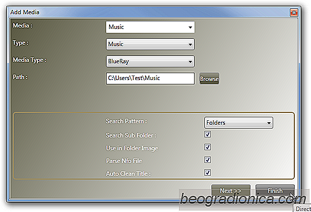 Para agregar medios a la aplicación, haga clic en Acción en la esquina superior izquierda y seleccione Agregar> Agregar medios . En la ventana Agregar Medios , ingrese el nombre Medios , seleccione Escriba e ingrese la Ruta de su colección. Defina Patrón de búsqueda y haga clic en Finalizar una vez que haya terminado.